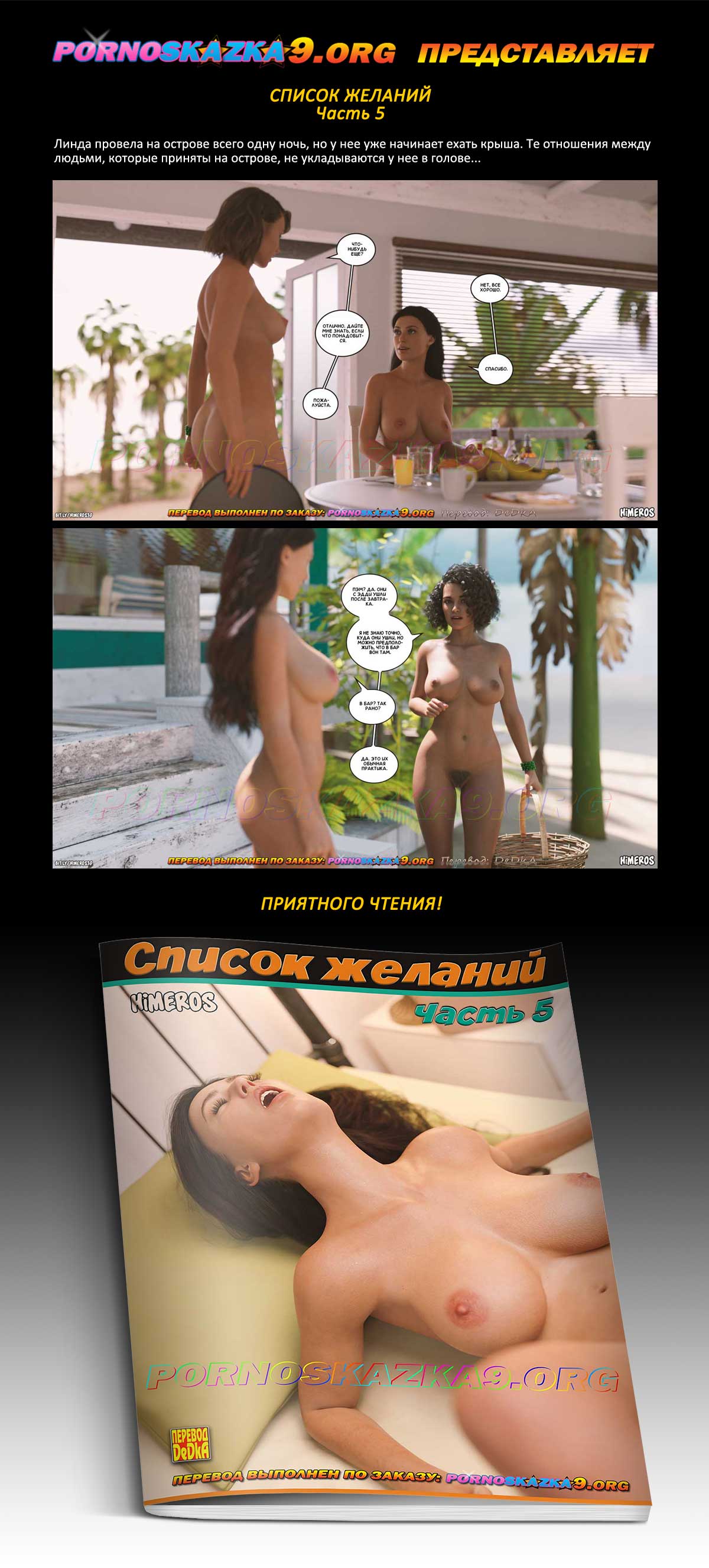 Порно комикс «Список желаний. Часть 5». Линда провела на острове всего одну ночь, но у нее уже начинает ехать крыша. Те отношения между людьми, которые приняты на острове, не укладываются у нее в голове…